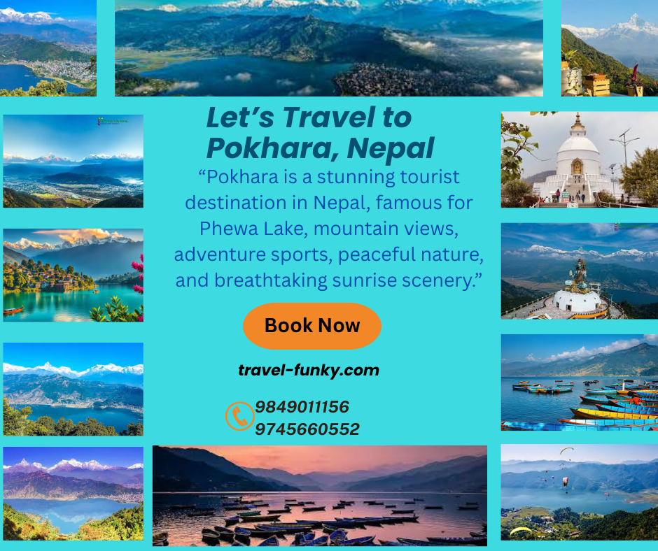 A full-day city tour of Pokhara, Nepal, offers a wonderful opportunity to explore the natural beauty, cultural heritage, and adventure activities that this picturesque city has to offer. Here's a suggested itinerary for a day tour of Pokhara:Morning:Breakfast: Start your day with a hearty breakfast at your hotel or a local café.Seti River Gorge: Begin your tour by visiting the Seti River Gorge. You can walk along the bridge and enjoy the stunning views of the deep gorge and the turbulent river below.Gupteshwor Cave: Head to the Gupteshwor Cave, which is famous for its sacred cave and a waterfall inside. It's a unique experience to explore the cave system.Mid-Morning: 4. Devi's Fall: Visit Devi's Fall, also known as Patale Chhango, a natural waterfall that disappears underground. It's a beautiful spot for photography.International Mountain Museum: Spend some time at the International Mountain Museum to learn about the history, culture, and mountaineering in the region. It provides valuable insights into the Himalayan peaks and their climbers.Lunch: 6. Lunch Break: Enjoy lunch at a local restaurant, where you can savor Nepali or international cuisine.Afternoon: 7. Phewa Lake: After lunch, head to Phewa Lake, one of Pokhara's main attractions. You can hire a boat and paddle on the serene lake or simply stroll along the lakeside promenade.Barahi Temple: On an island in the middle of Phewa Lake, you'll find the Barahi Temple dedicated to the goddess Barahi. You can take a boat ride to reach the temple and explore its surroundings.Late Afternoon: 9. World Peace Pagoda: Drive or hike up to the World Peace Pagoda (Shanti Stupa) for panoramic views of Pokhara Valley and the Annapurna Range. It's a perfect spot to meditate or simply enjoy the peaceful atmosphere.Evening: 10. Lakeside Area: Return to Lakeside Pokhara, the city's vibrant hub. You can explore the shops, cafes, and restaurants along the lakeshore. Don't miss the chance to try some delicious Nepali cuisine for dinner.Nightlife: If you're interested in nightlife, Pokhara offers several bars and clubs where you can enjoy live music or a relaxed evening with fellow travelers.This itinerary provides a well-rounded experience of Pokhara, from its natural wonders to cultural sites and leisurely activities. Keep in mind that Pokhara has many more attractions and activities to offer, so feel free to customize your tour based on your interests and the time you have available.